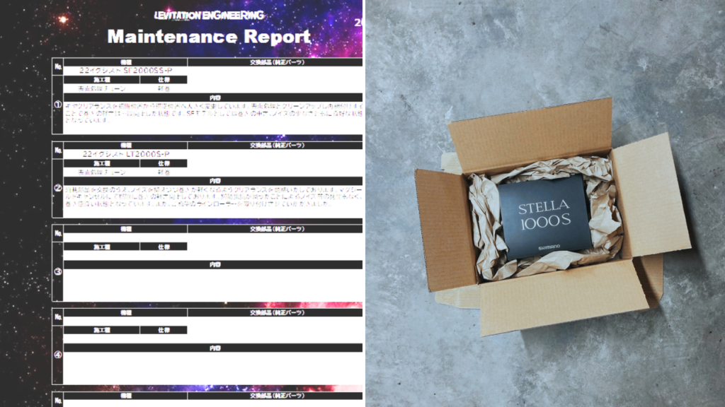 施工前の記録をもとに最終検品を行い、改善度合いとリールの最終状態を確認します。調整がシビアなリールは、ここから分解と再調整を複数回繰り返すこともしばしばあります。
